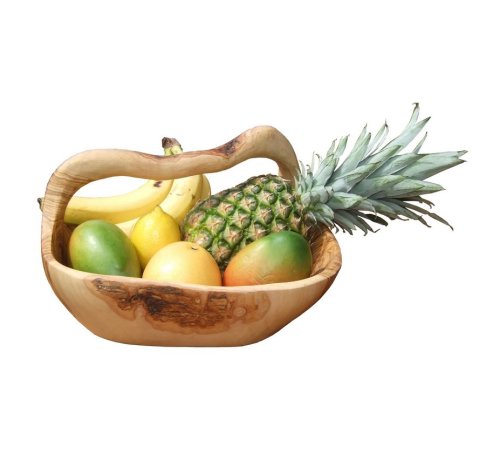 A really stunning product, this olive wood fruit bowl is as a fruit bowl or bread basket... Each one is completely unique, with varying shapes and styles for handles. Length is +/- 1 inch