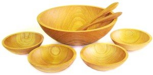 Solid Cherry wood set comes with one 15-inch wooden serving bowl, six 7-inch wooden side bowls, and one set of 12-inch wooden utensils. All items in this set have a light finish.No Glues, fillers, laminating just natural solid wood.